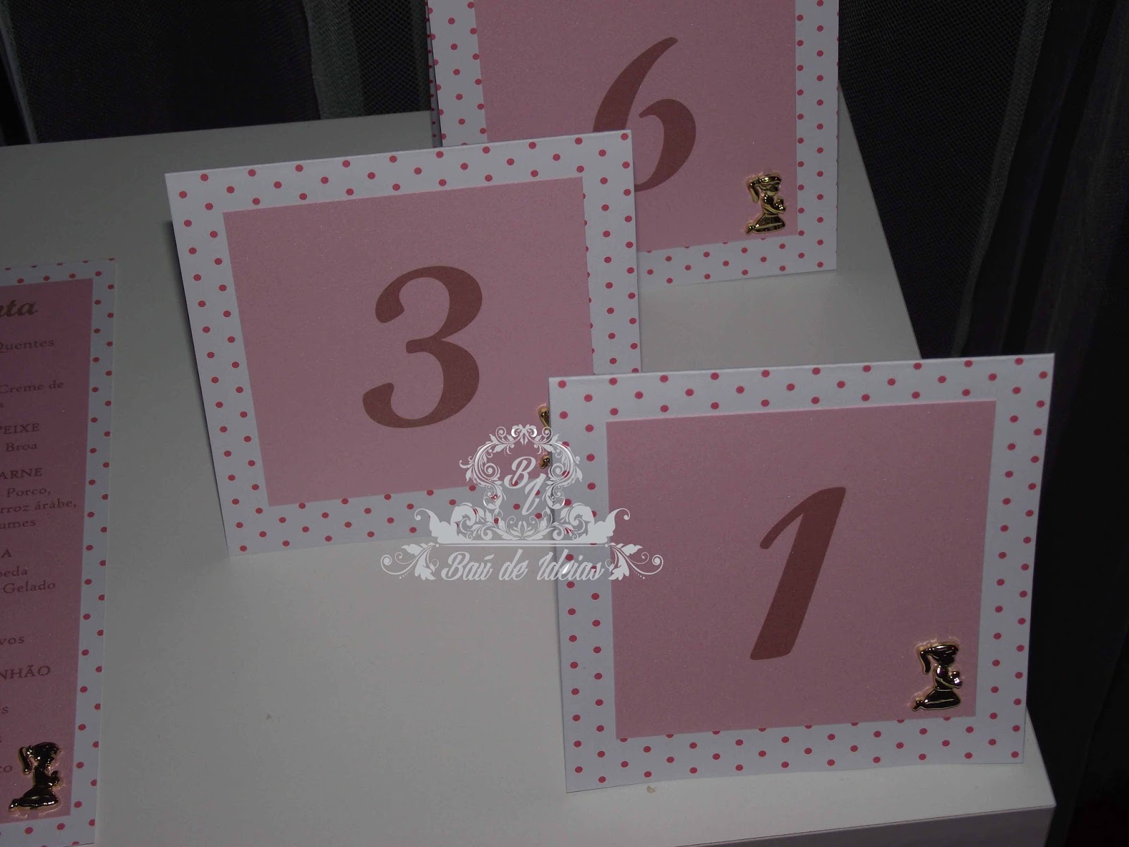 Marcador e ementa em tons de bege e dourado, com cordão.