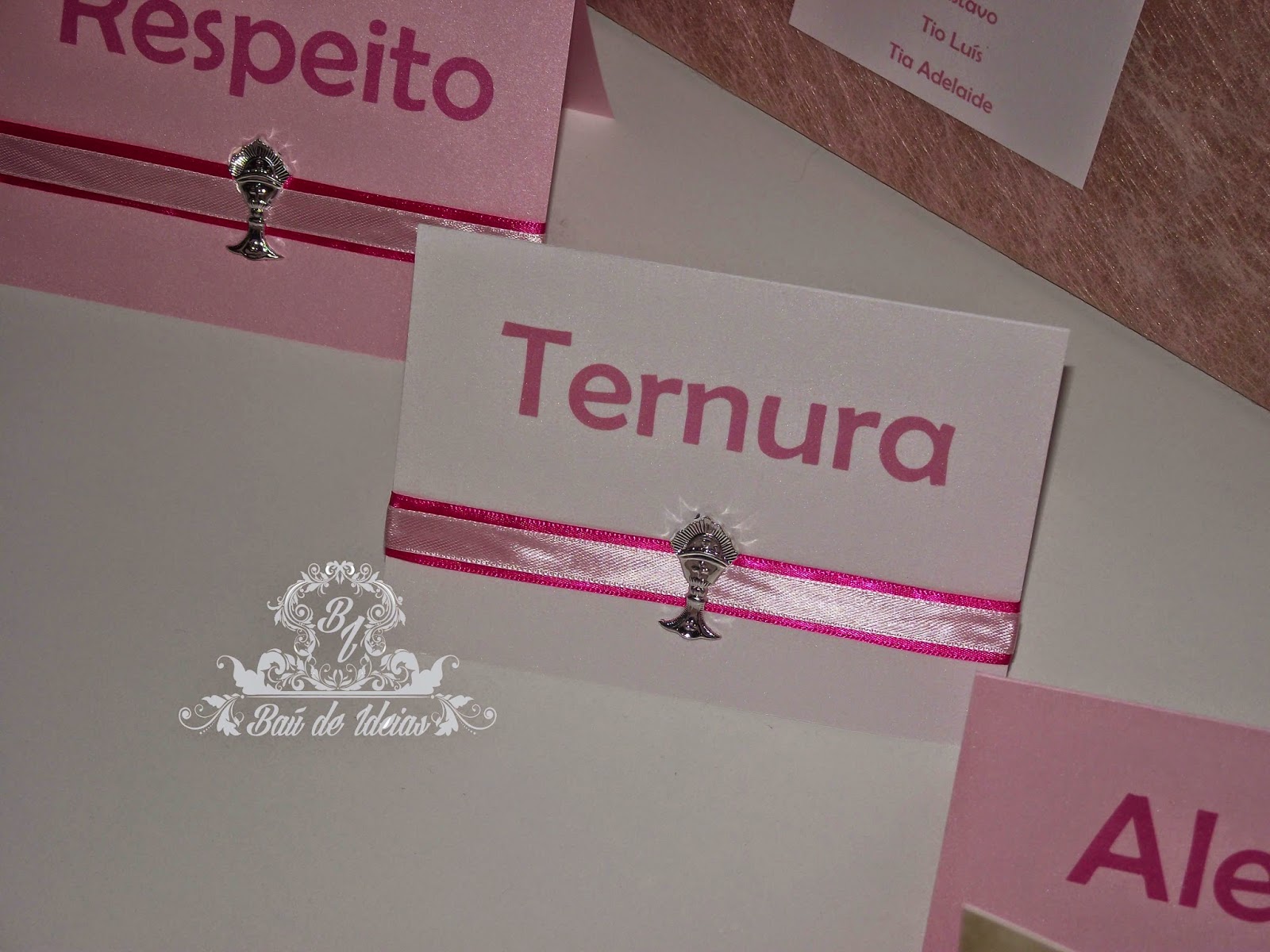 Placard de Mesas para Primeira Comunhão ou Profissão de Fé, em tons de rosa forte, branco e prateado, com cálices e espigas.