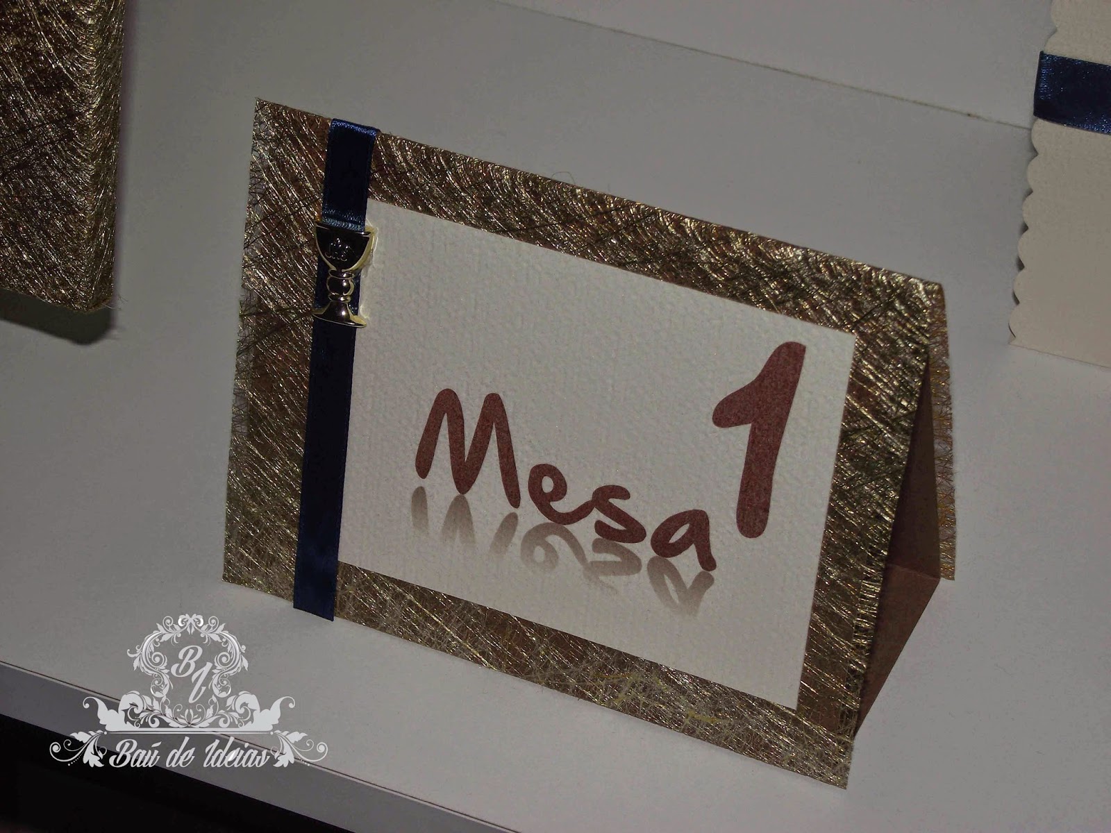 Marcadore de mesas bege e azul escuro, com cálice dourado.