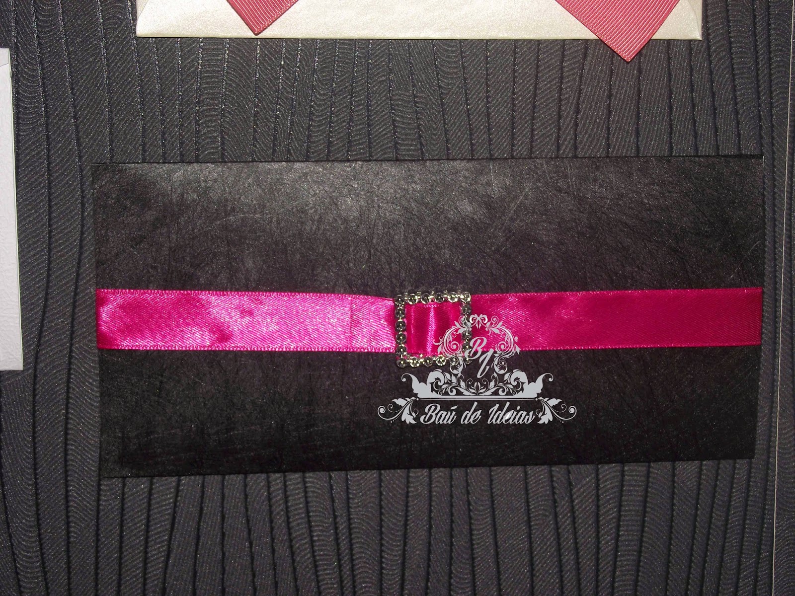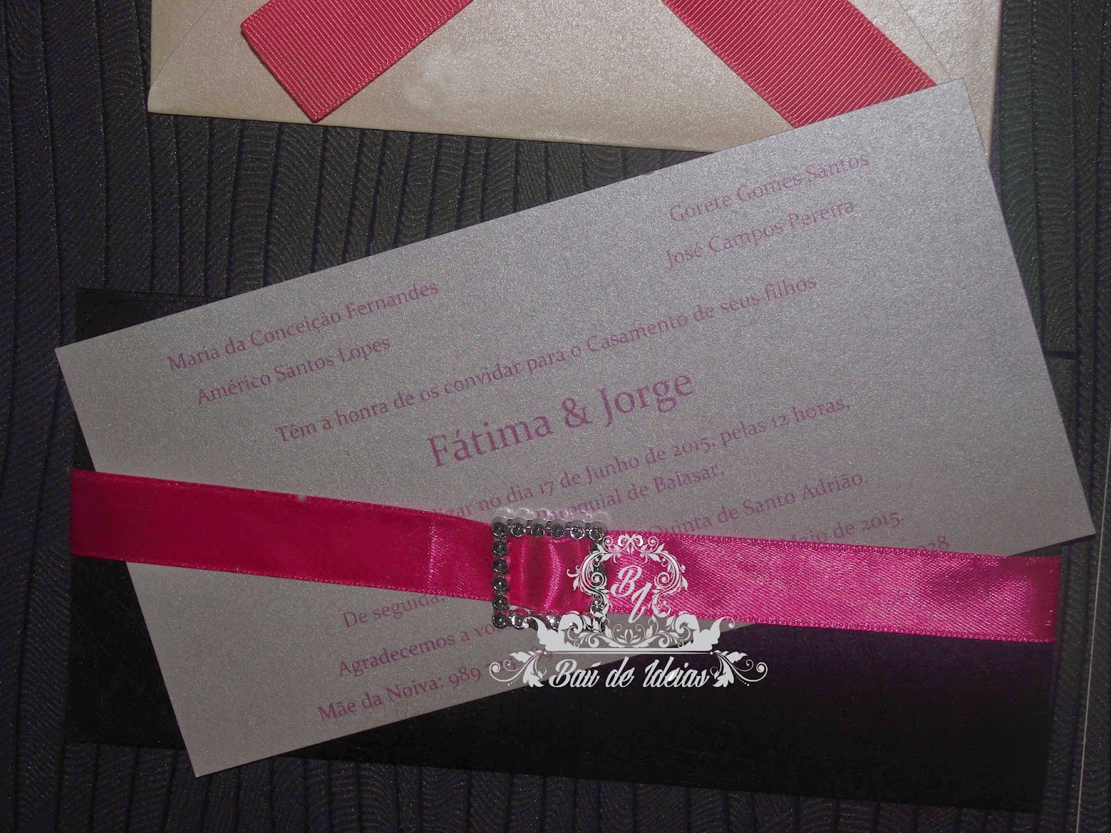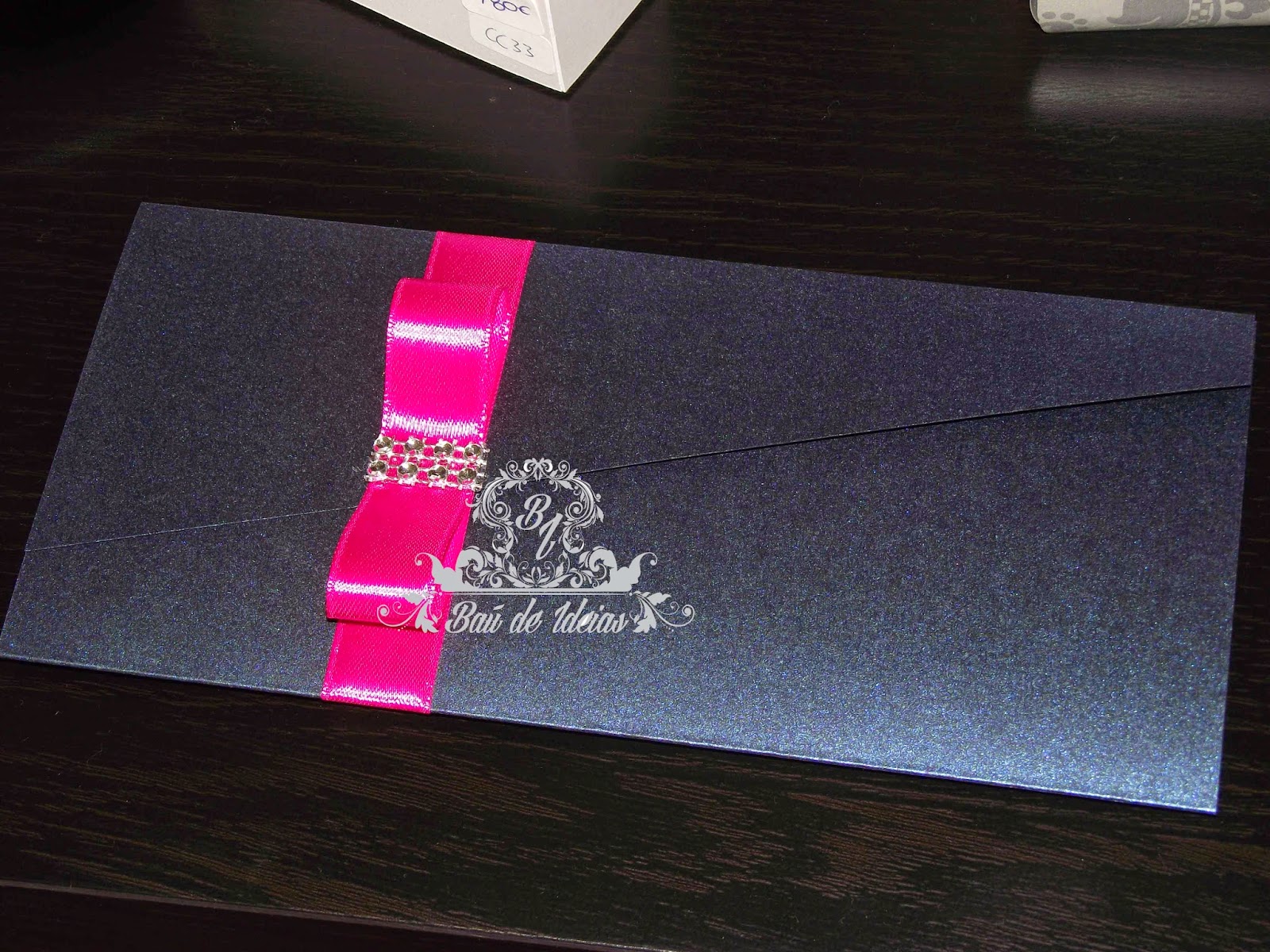 Convite de Casamento em papel com textura, tons de preto, prateado e rosa.
