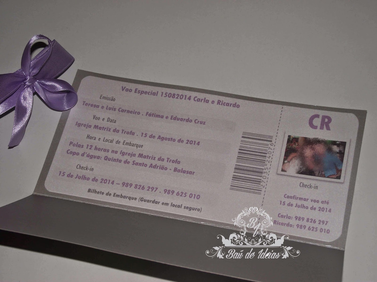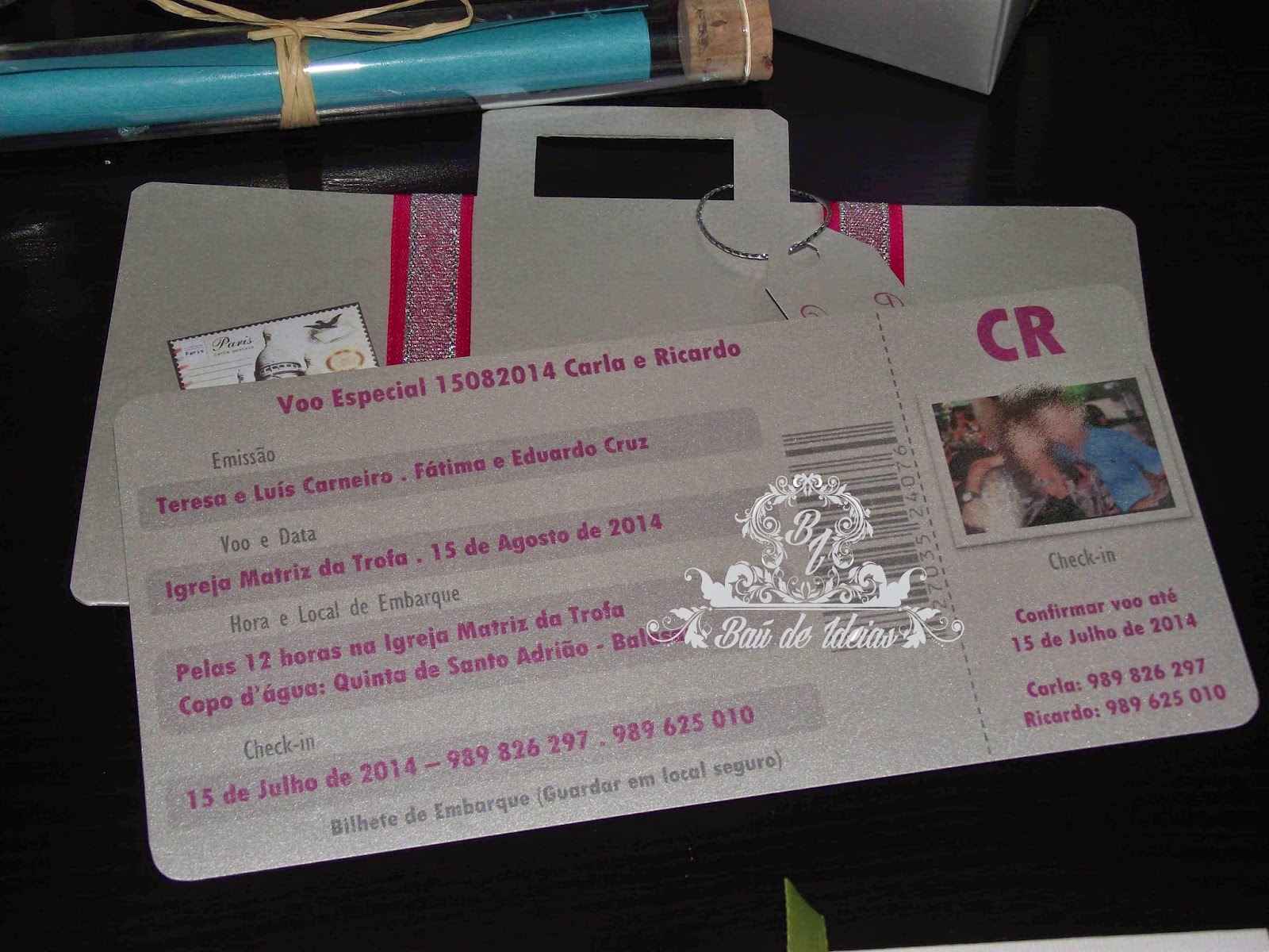 Convite para tema de Casamento Viagens, com texto em forma de bilhete de avião.