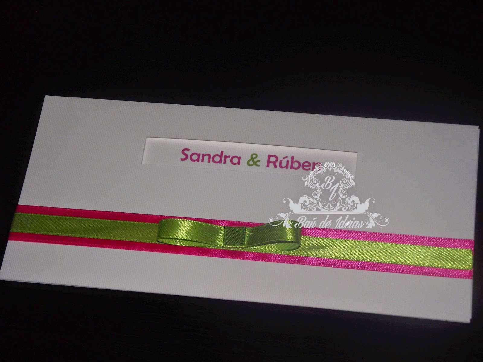 Convite em tons de branco, rosa e verde, com abertura no centro com nomes dos noivos.