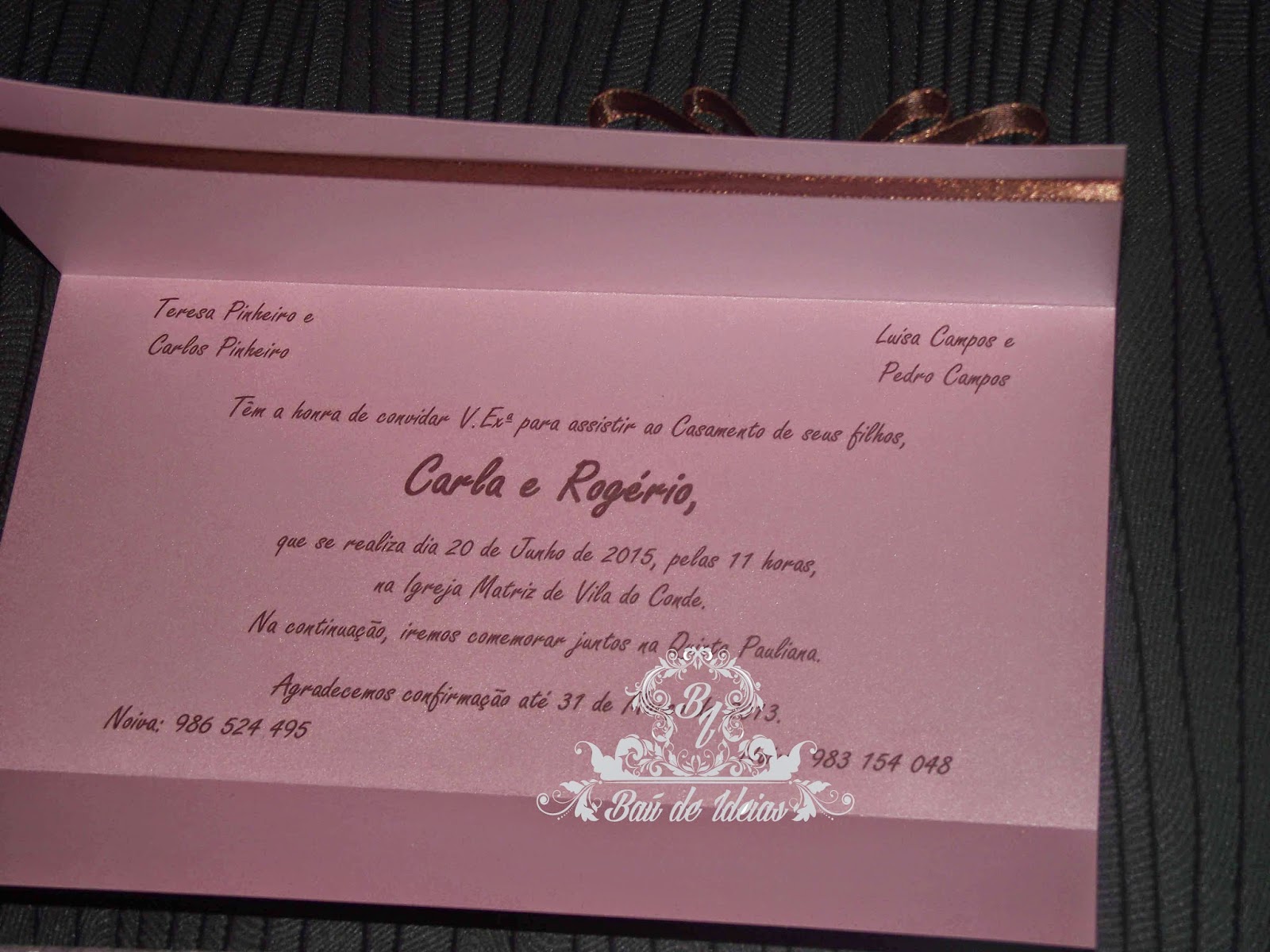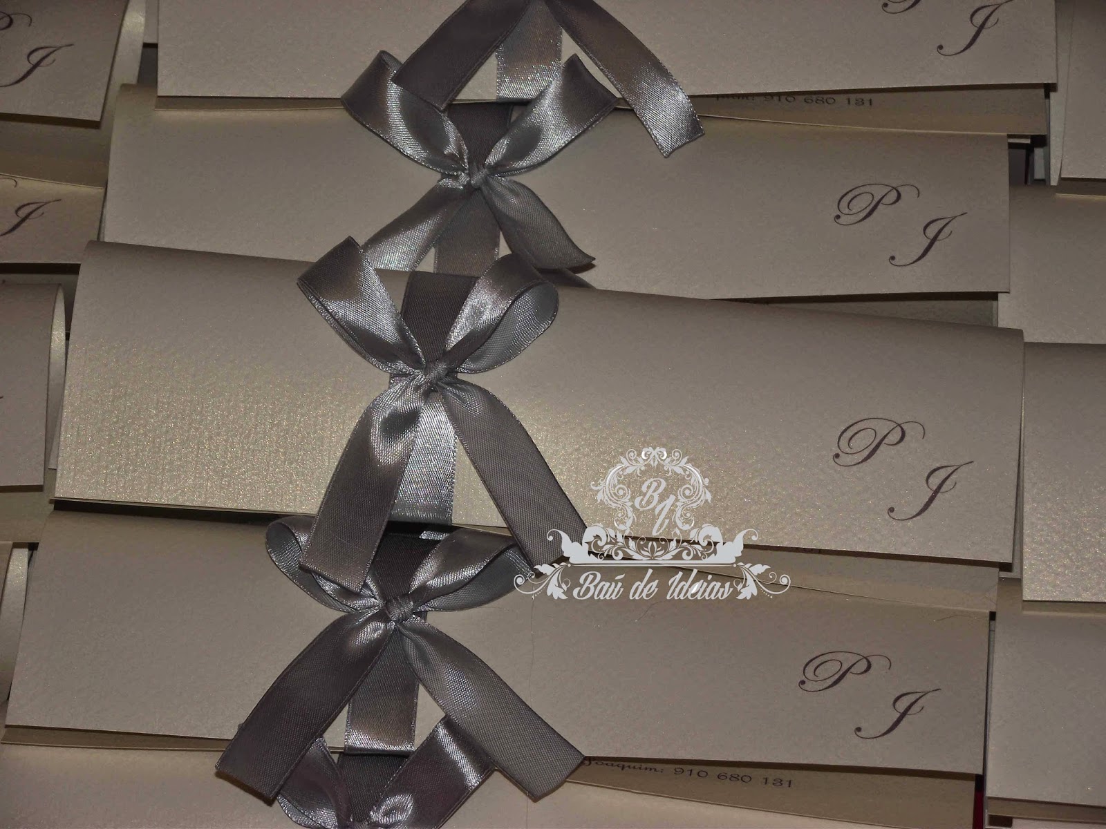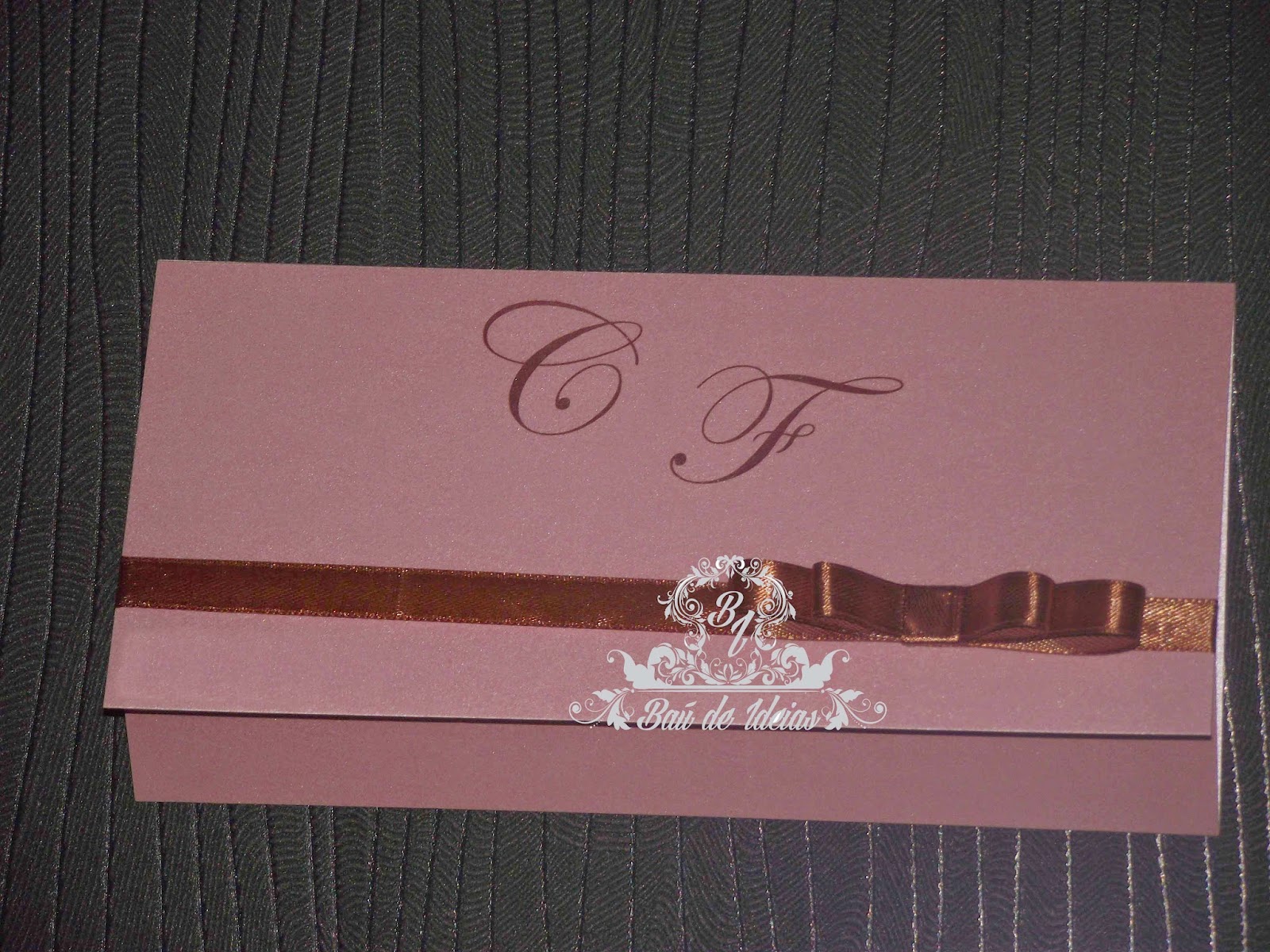 Convite de Casamento com iniciais e laço e texto impresso no interior.