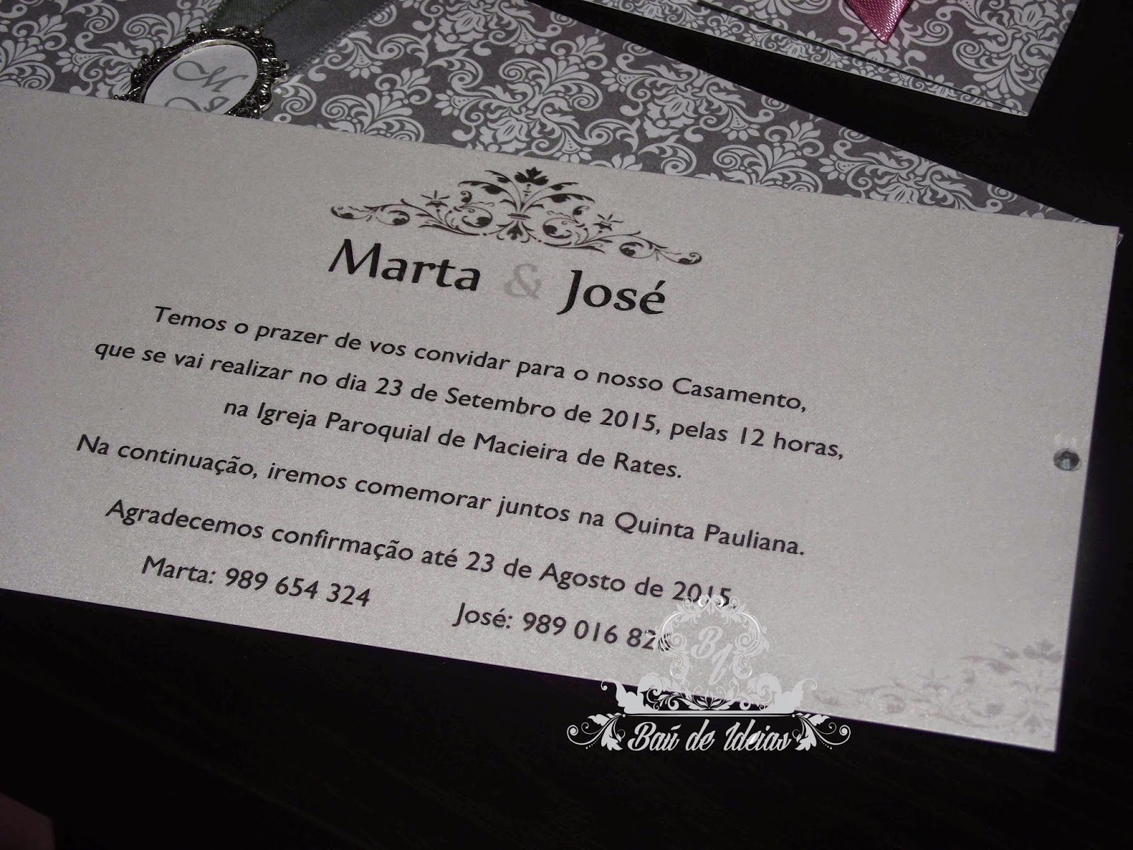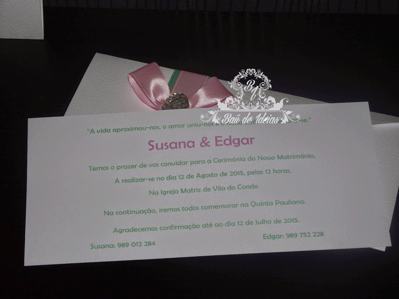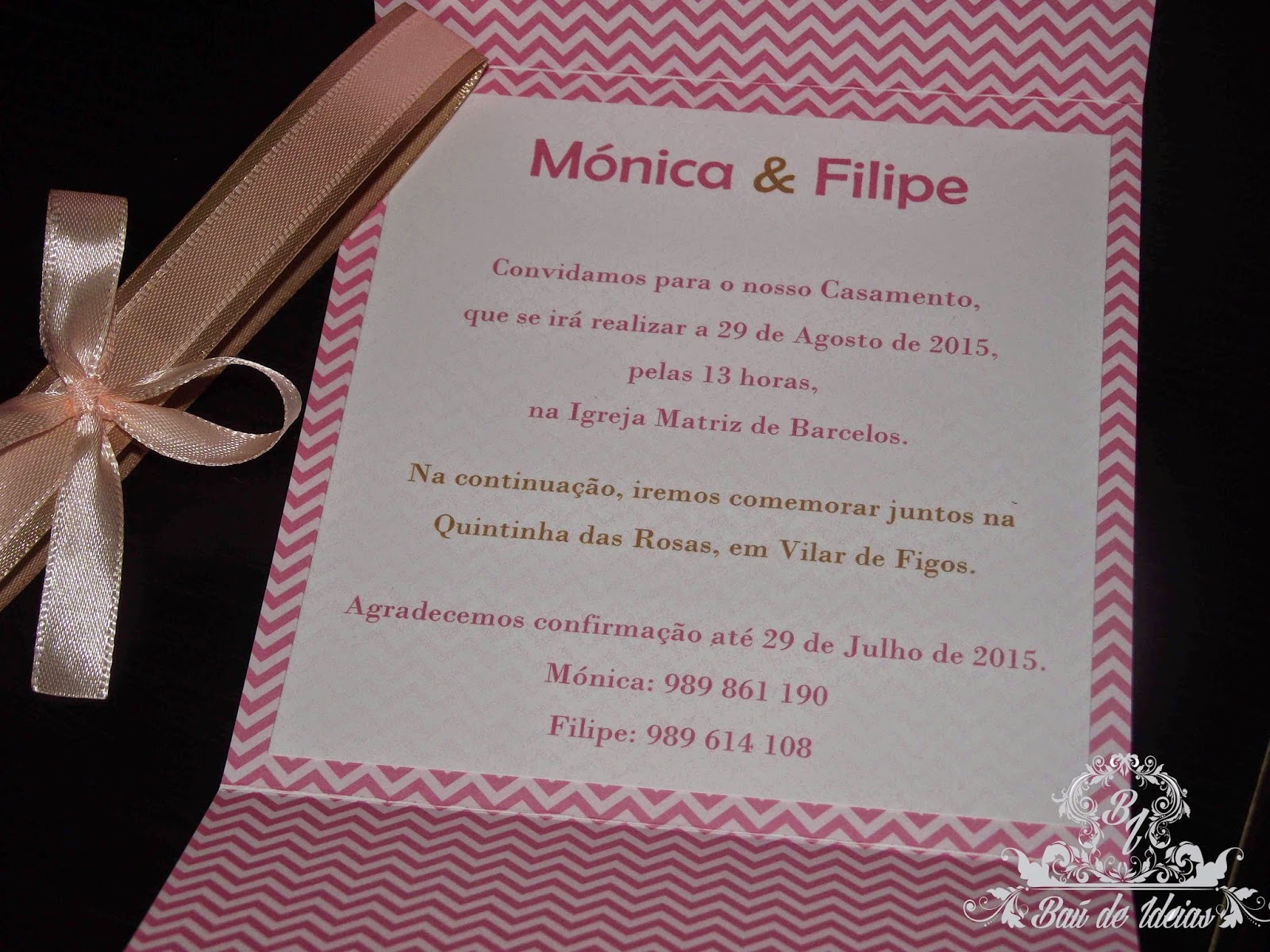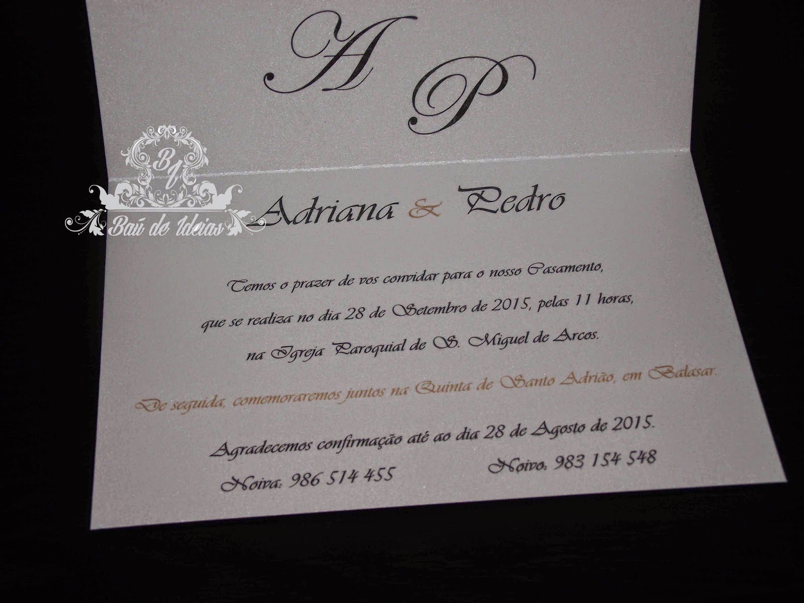 Convite de Casamento com iniciais e laço e texto impresso no interior.