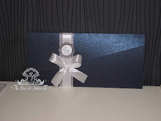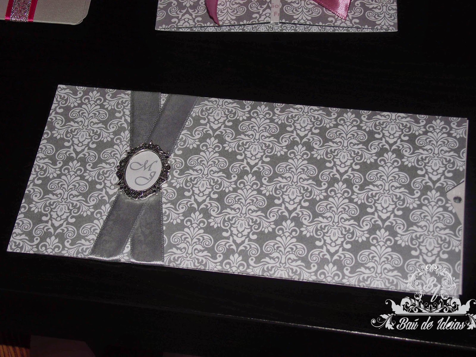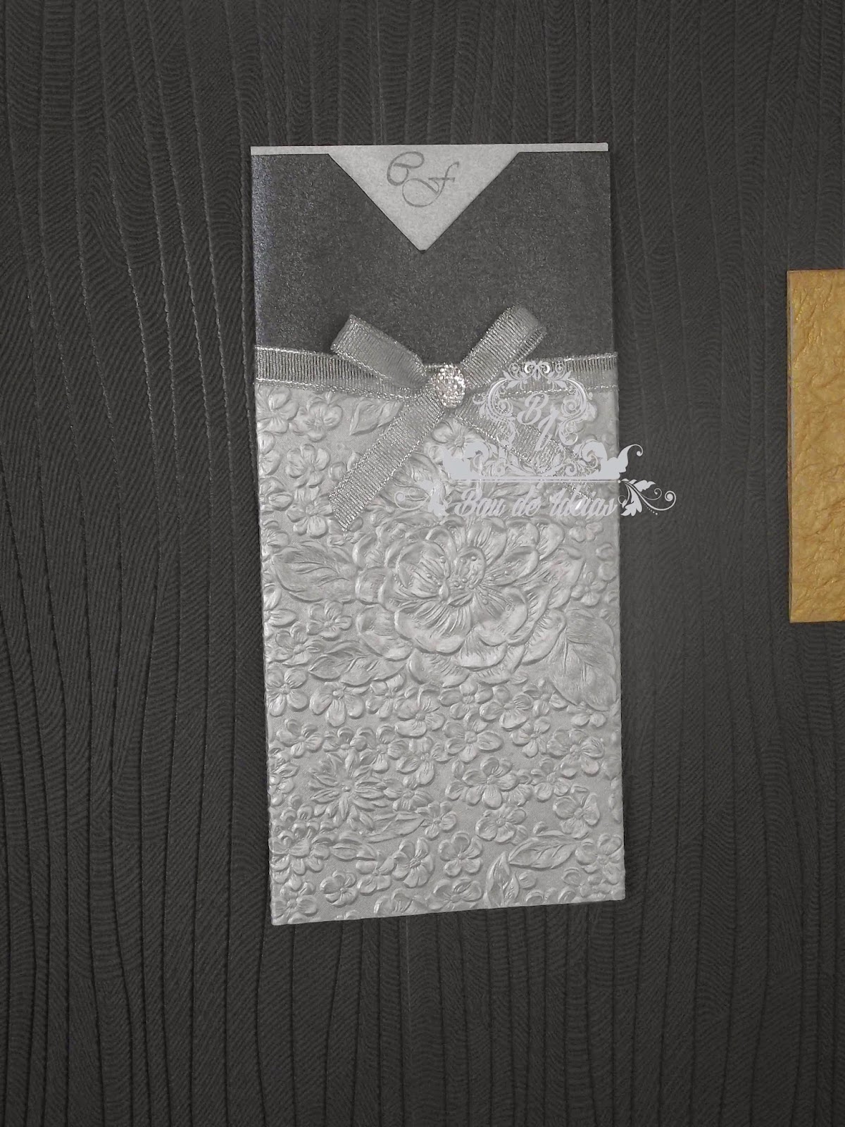 Convite em tons de prateado e preto com abertura para mostrar as iniciais.