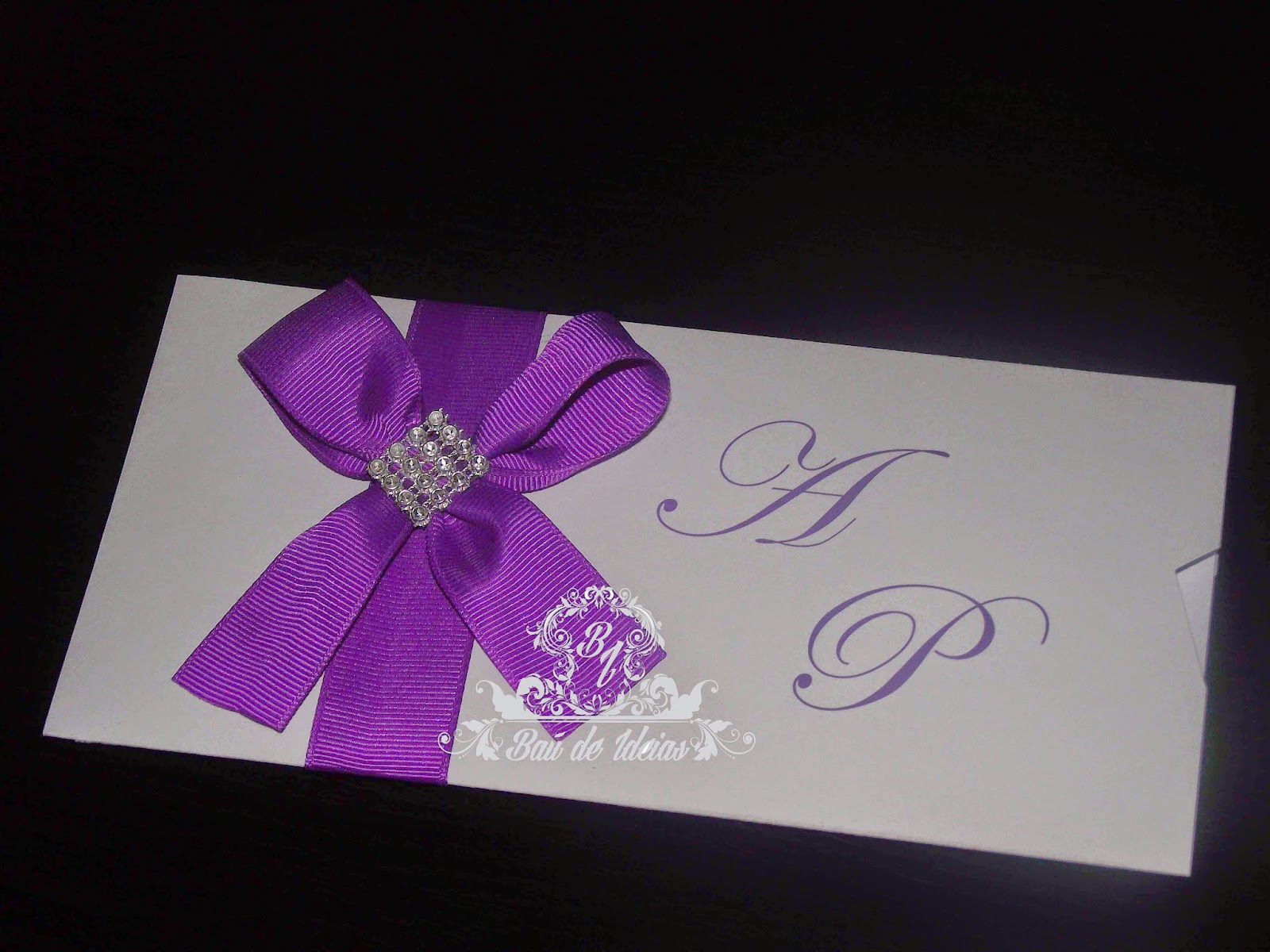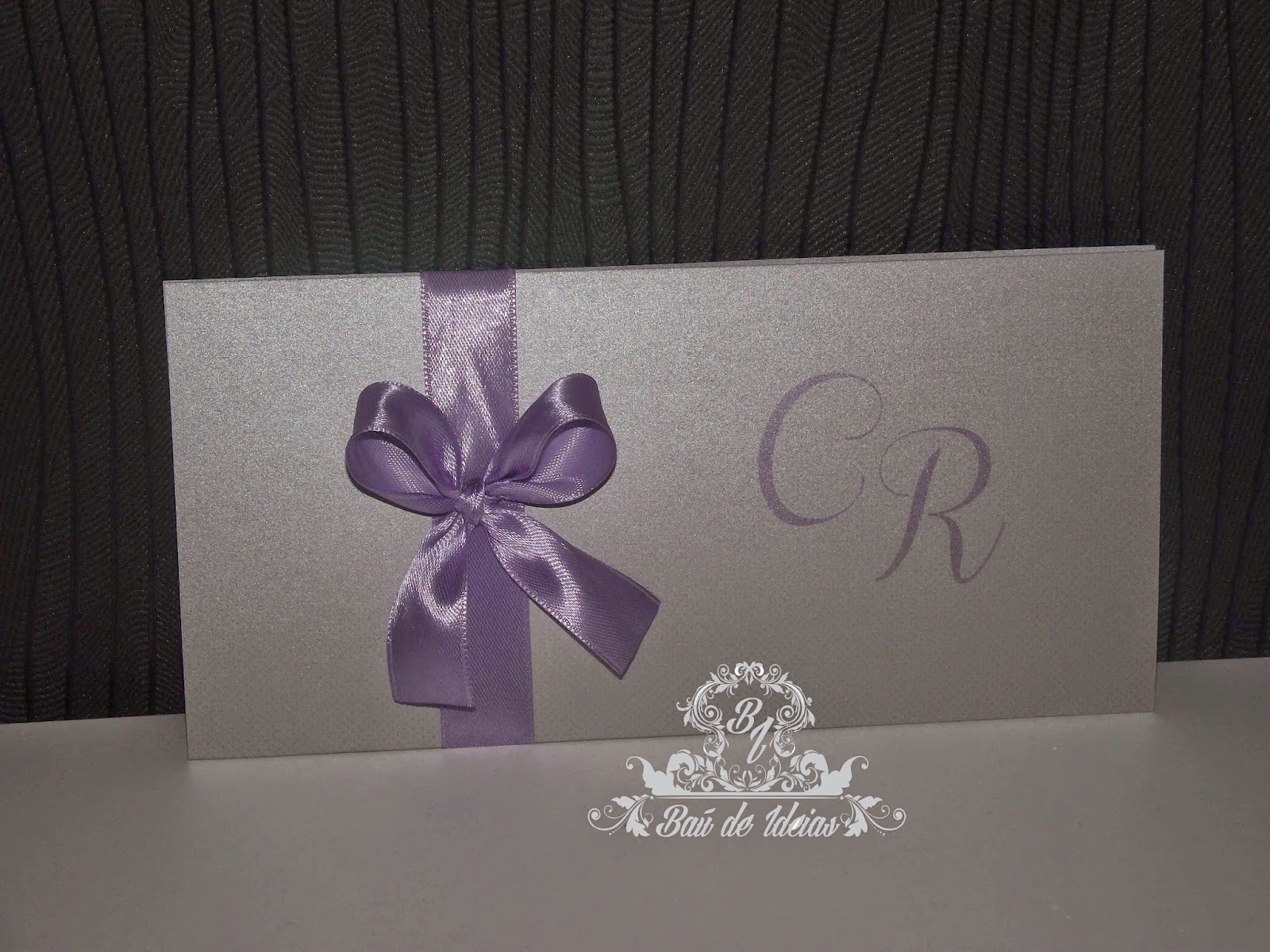Convite em papel com textura, branco e lilás, com iniciais dos noivos.