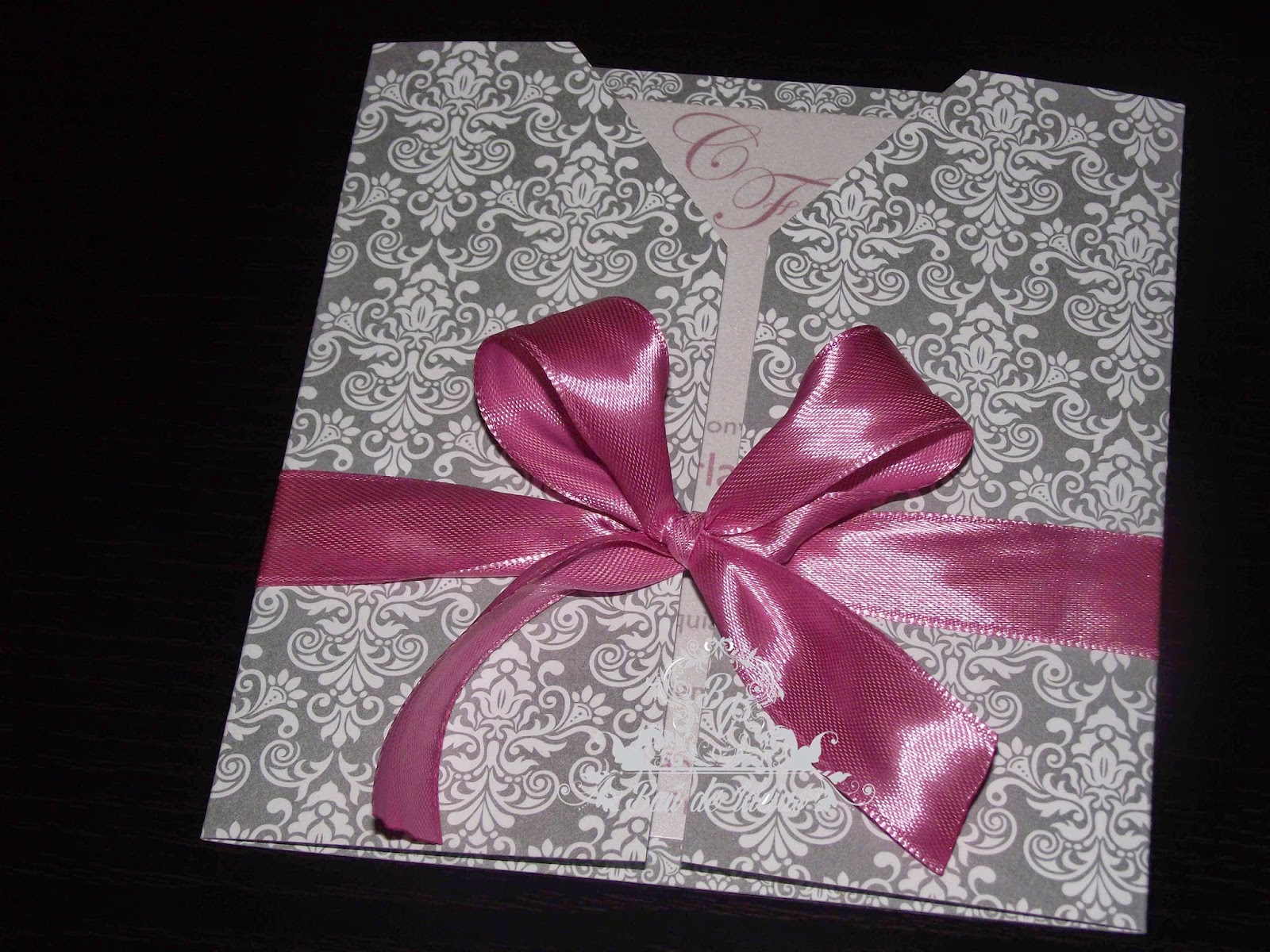 Convite de Casamento vertical com papel estilo vintage, tons de prata, branco e rosa.