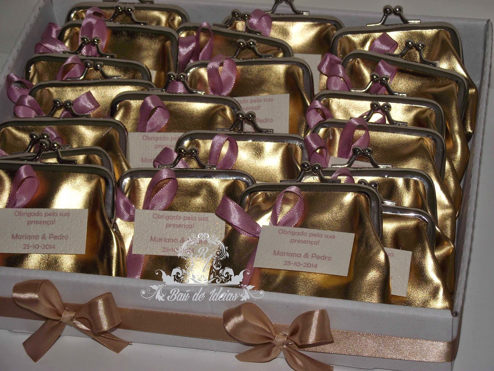 Porta-moedas dourado ou prateado, com decoração para lembrança de Casamento.
