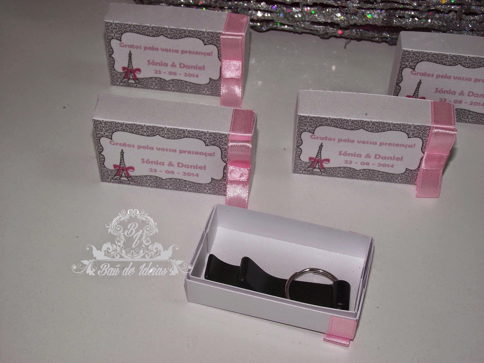 Porta-chaves abre-latas com caixa personalizada tema Paris/Viagens.